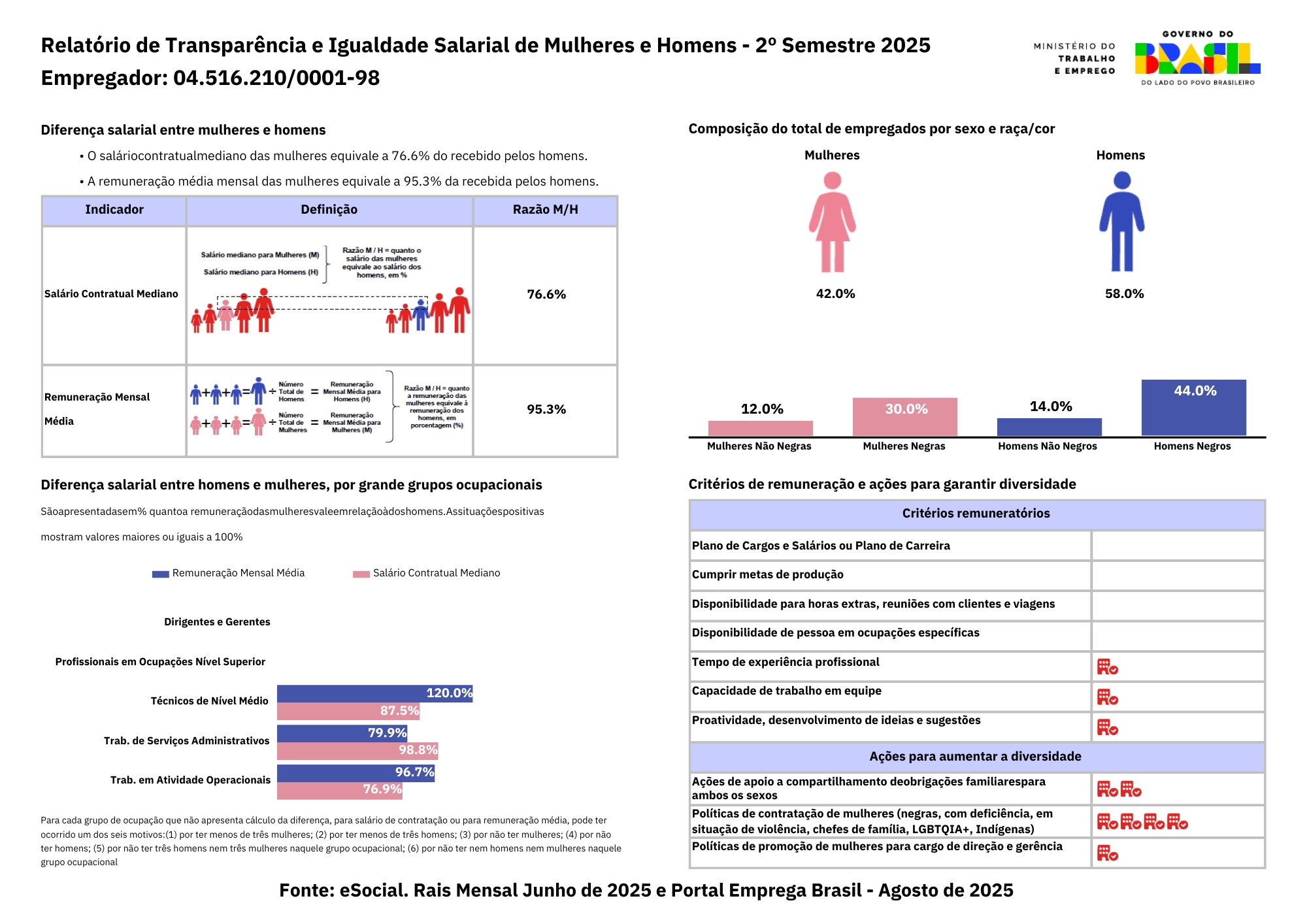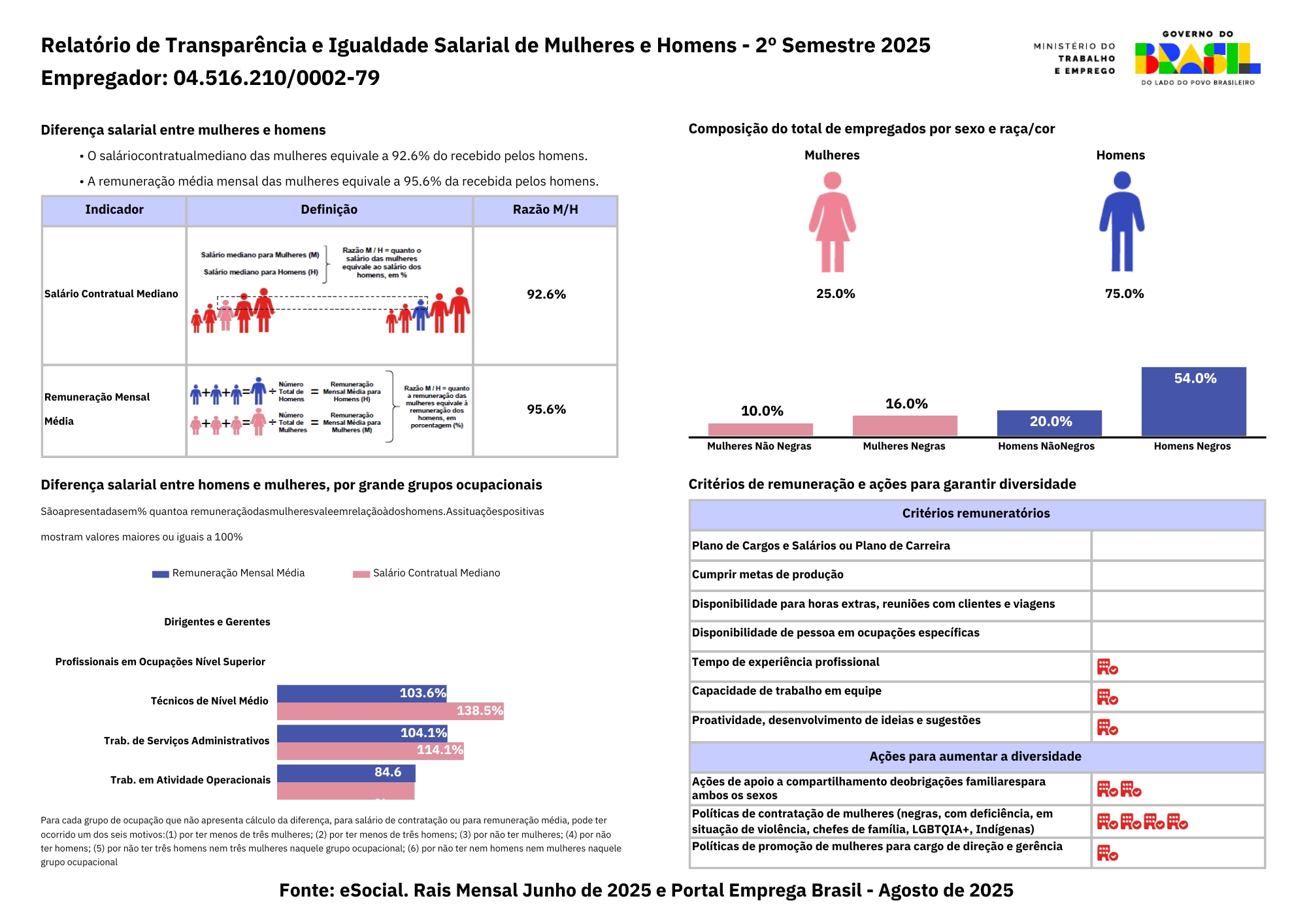 A publicação deste relatório reafirma nosso compromisso com a ética, a responsabilidade social e a valorização de cada colaborador. Mais do que atender a uma obrigação legal, acreditamos que a transparência é essencial para fortalecer a confiança e a construção de um ambiente mais justo e inclusivo.